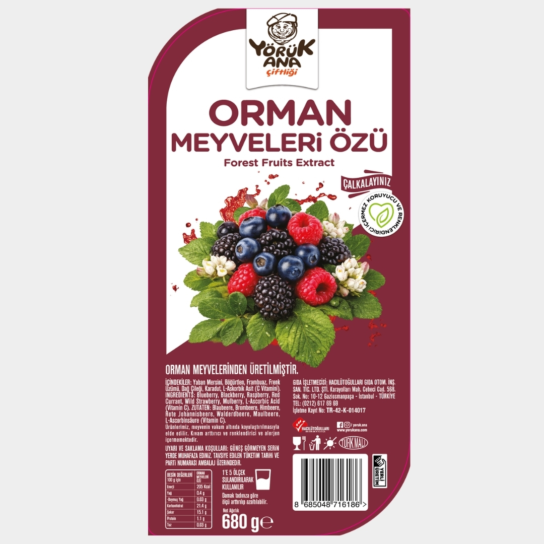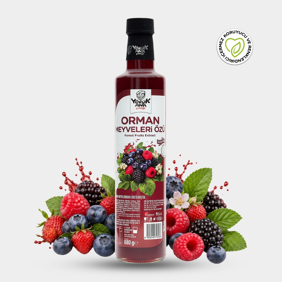 Yörük Ana Çiftliği Orman Meyveleri Özü, yaban mersini, böğürtlen, frambuaz, Frenk üzümü ve karadutun yoğun aromalarını bir araya getiren özel meyve özüdür. Ferahlatıcı içeceklerden tatlı tariflerine kadar çok yönlü kullanım sunar. Koruyucu ve renklendirici içermez. 1’e 5 sulandırılarak kullanılır.